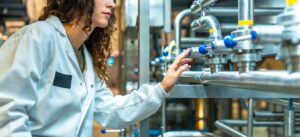 Woman engineer checking machinery in food processing factory