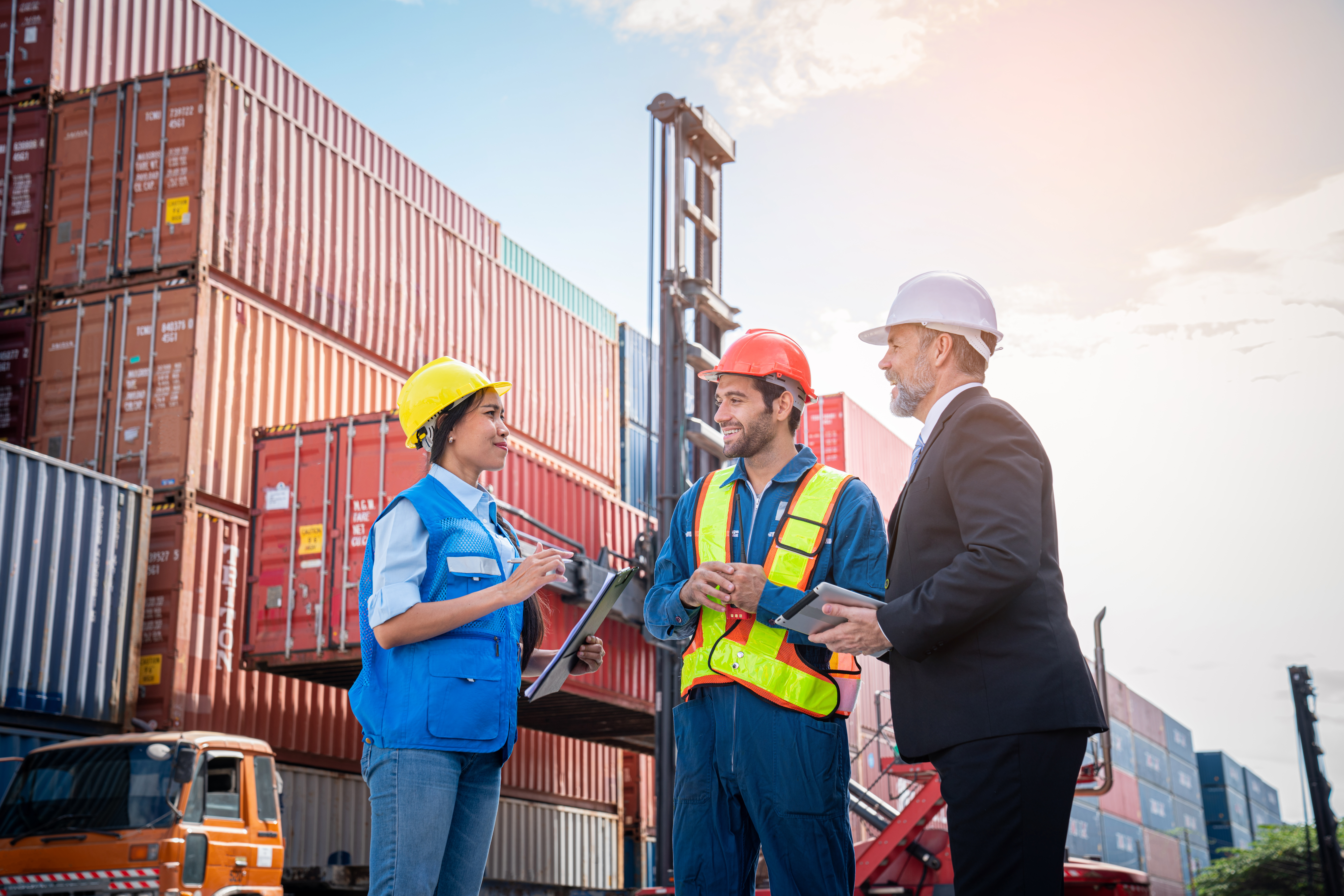 Container yard manager talking to foreman inside the warehouse